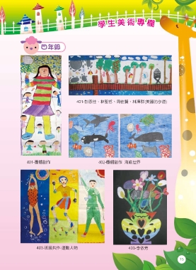 學 生 美 術 專 欄 四年級 401-彭恩佳、林聖哲、周佳賢、林澤群(美麗的步道) 401-團體創作 402-團體創作 海底世界 403-班級共作-運動人物 403-李依芳