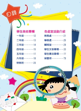 目錄 學生美術專欄 各處室活動介紹 一年級…………12 教務處……………21 二年級…………13 學務處……………25 三年級…………14 輔導室……………29 四年級…………15 學生文章專欄……33 五年級…………17 學生書法專欄……77 六年級…………18 榮譽榜……………79 特教班…………20