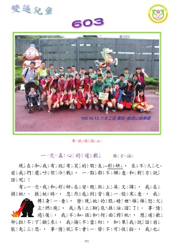 畢旅劍湖山 一次真心的道歉 蘇子涵 現在和我有說有笑的朋友-彩妍,在不久之 前我們還吵架冷戰,一點都不願意和對方說 話呢! 有一次我和彩妍在安親班上英文課,我在 損她、糗她時,忽然感到背後一股寒意,我 轉身一看,發現她的眼睛裡雄雄怒火 正燃燒,我馬上腳底抹油溜了。事情 過後,我不知該如何面對她,想道歉 卻拉不下臉來,我悔不當初,如果我說話前 能先三思,事情就不會一發不可收拾,我也 121