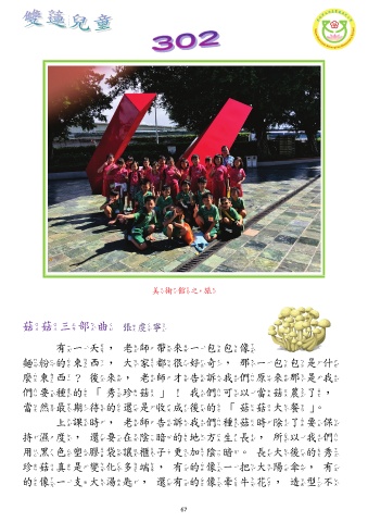 美術館之旅 菇菇三部曲 張虔寧 有一天,老師帶來一包包像 麵粉的東西,大家都很好奇,那一包包是什 麼東西?後來,老師才告訴我們原來那是我 們要種的「秀珍菇」!我們可以當菇農了, 當然最期待的還是收成後的「菇菇大餐」。 上課時,老師告訴我們種菇時除了要保 持濕度,還要在陰暗的地方生長,所以我們 用黑色塑膠袋讓櫃子更加陰暗。長大後的秀 珍菇真是變化多端,有的像一把大陽傘,有 的像一支大湯匙,還有的像牽牛花,造型不 67
