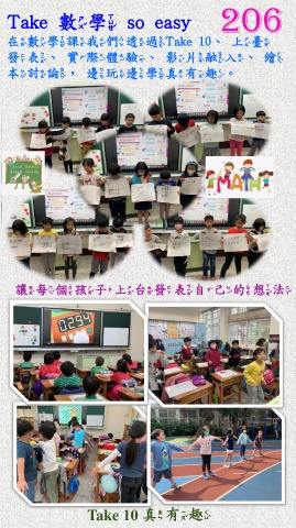 Take 數學 so easy 206 在數學課我們透過Take 10、上臺 發表、實際體驗、影片融入、繪 本討論,邊玩邊學真有趣。 讓每個孩子上台發表自己的想法 Take 10 真有趣