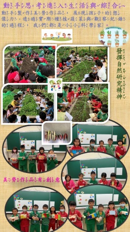 動手思考進入生活與綜合~ 動手製作美勞作品,展現孩子的想 像力,透過實際種植蔬菜與觀察紀錄 的過程,我們都是小小科學家。 發 揮 自 然 研 究 精 神 美勞作品有創意