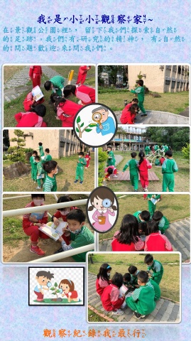 我是小小觀察家~ 在景觀公園裡,留下我們探索自然 的足跡,我們有研究的精神,有自然 的問題歡迎來問我們。 觀察紀錄我最行