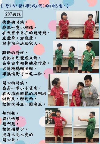 【努力發揮我們的創意】 207的想 快樂的時候, 我像一隻小蝴蝶, 在天空中自在的飛呀飛, 左飛飛,右飛飛, 把幸福分送給家人。 難過的時候, 我把自己變成火箭, 在宇宙中輕快的看呀看, 火箭穩穩衝哇衝, 讓懊惱衝得一乾二淨。 開心的時候, 我是ㄧ隻小小鯊魚, 在大海裡輕鬆的游啊游, 游到東,游到西, 把愉悅游成一圈泡泡。 想啊想, 留住快樂, 想啊想, 把懊惱變少, 成為人見人愛的 開心果。