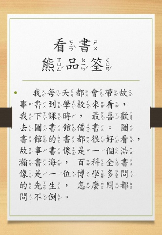 看書 熊品筌 • 我每天都會帶故 事書到學校來看, 我下課時,最喜歡 去圖書館借書。圖 書館的書都很好看, 故事書像是一個浩 瀚書海,百科全書 像是一位博學多問 的先生,怎麼問都 問不倒。