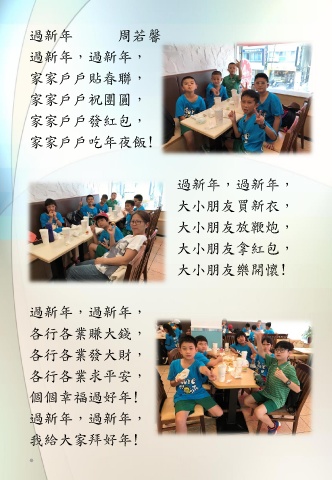 過新年 周若馨 過新年,過新年, 家家戶戶貼春聯, 家家戶戶祝團圓, 家家戶戶發紅包, 家家戶戶吃年夜飯! 過新年,過新年, 大小朋友買新衣, 大小朋友放鞭炮, 大小朋友拿紅包, 大小朋友樂開懷! 過新年,過新年, 各行各業賺大錢, 各行各業發大財, 各行各業求平安, 個個幸福過好年! 過新年,過新年, 我給大家拜好年! •