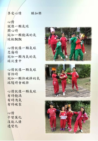 享受心情 賴加樂 心情 就像一顆氣球 開心時 宛如一顆飽滿的氣 球輕飄飄 心情就像一顆氣球 悲傷時 宛如一顆洩氣的氣 球沉重中 心情就像一顆氣球 害怕時 宛如一顆快破掉的氣 球隨時會破掉 心情就像一顆氣球 有時飽滿 有時洩氣 有時破裂 心情 千變萬化 沒能人猜 透變化
