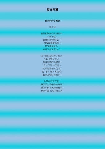 詩文共賞 動物們的音樂會 楊士德 樹林裡細細的光照進來, 午夜十點, 興奮的動物們來了, 請貓頭鷹當指揮, 請猩猩當鼓手, 這場音樂會開始了。 第一個是貓吹奏小喇叭, 吹起來聲音宏亮, 接著是熊的小提琴, 音一下長 一下短, 再來是猴子的長笛, 音一快一慢,真悅耳, 觀眾直喊好和拍手。 吹呀拉呀真好聽, 最後是全體動物的演奏, 牠們叫醒了沉睡的觀眾, 牠們叫醒了沉睡的太陽。