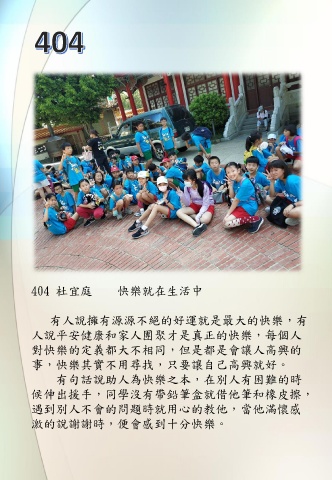 404 杜宜庭 快樂就在生活中 有人說擁有源源不絕的好運就是最大的快樂,有 人說平安健康和家人團聚才是真正的快樂,每個人 對快樂的定義都大不相同,但是都是會讓人高興的 事,快樂其實不用尋找,只要讓自己高興就好。 有句話說助人為快樂之本,在別人有困難的時 候伸出援手,同學沒有帶鉛筆盒就借他筆和橡皮擦, 遇到別人不會的問題時就用心的教他,當他滿懷感 激的說謝謝時,便會感到十分快樂。