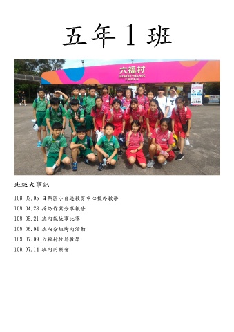 五年 1 班 班級大事記 109.03.05 日新國小自造教育中心校外教學 109.04.28 採訪作業分享報告 109.05.21 班內說故事比賽 109.06.04 班內分組烤肉活動 109.07.09 六福村校外教學 109.07.14 班內同樂會