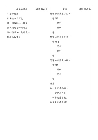 美味的草莓 5129 林羽萱 香蕉 5105 蔡沛弘 冬日的精靈 彎彎的香蕉是小船, 非常嬌小又可愛 彎啊! 像一個精緻的小燈籠 彎啊! 像一顆閃亮的紅寶石 彎啊! 像ㄧ顆讓人心動的愛心 彎! 既美味又可口 彎彎的香蕉是月亮, 彎啊 ! 彎啊! 彎啊! 彎! 彎彎的香蕉是小橋, 彎啊! 彎啊! 彎啊! 彎! 香蕉! 你一會兒是小船、 一會兒是月亮、 一會兒是小橋﹐ 你究竟是甚麼呢?