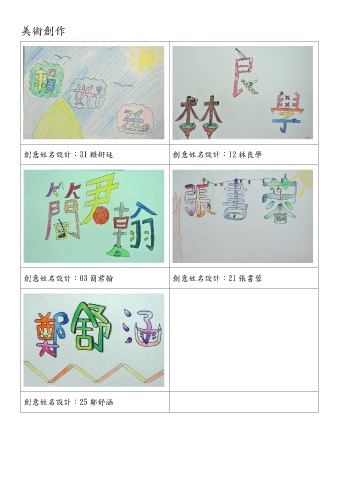 美術創作 創意姓名設計:31 賴姸廷 創意姓名設計:12 林良學 創意姓名設計:03 簡君翰 創意姓名設計:21 張書蓉 創意姓名設計:25 鄭舒涵