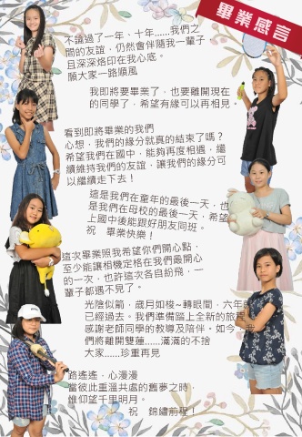 我即將要畢業了,也要離開現在 的同學了,希望有緣可以再相見。 光陰似箭,歲月如梭~轉眼間,六年就 已經過去。我們準備踏上全新的旅程, 感謝老師同學的教導及陪伴。如今,我 們將離開雙蓮……滿滿的不捨 大家……珍重再見 路遙遙,心漫漫 當彼此重溫共處的舊夢之時, 惟仰望千里明月。 祝 錦繡前程!