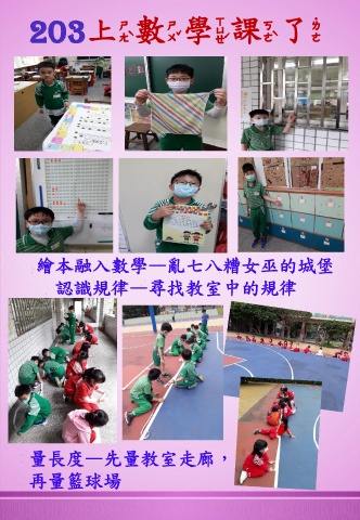 203上數學課了 繪本融入數學—亂七八糟女巫的城堡 認識規律—尋找教室中的規律 量長度—先量教室走廊, 再量籃球場