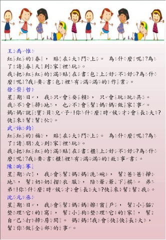 星期六,我會幫媽媽洗碗,幫爸爸掃