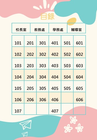 校長室 教務處 學務處 輔導室 101 201 301 401 501 601 102 202 302 402 502 602 103 203 303 403 503 603 104 204 304 404 504 604 105 205 305 405 505 605 106 206 306 406 606 107 407