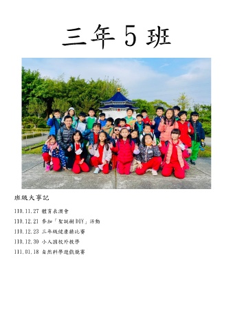 三年 5 班 班級大事記 110.11.27 體育表演會 110.12.21 參加「聖誕樹 DIY」活動 110.12.23 三年級健康操比賽 110.12.30 小人國校外教學 111.01.18 自然科學遊戲競賽