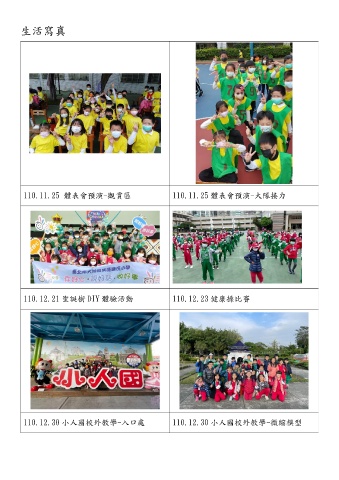 生活寫真 110.11.25 體表會預演-觀賞區 110.11.25 體表會預演-大隊接力 110.12.21 聖誕樹 DIY 體驗活動 110.12.23 健康操比賽 110.12.30 小人國校外教學-入口處 110.12.30 小人國校外教學-微縮模型