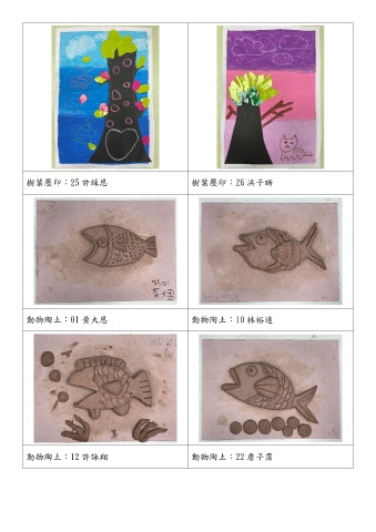 樹葉壓印:25 許綵恩 樹葉壓印:26 洪子晰 動物陶土:01 黃大恩 動物陶土:10 林裕達 動物陶土:12 許詠翔 動物陶土:22 詹子霈