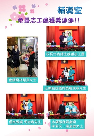 恭喜志工團獲獎連連!! 校長代表師生感謝志工團 金鑽獎林慧貞女士 志願服務銀牌獎唐原章先生 優良導護 柯忠育先生 志願服務貢獻獎 李莉文、盧彥蓉女士