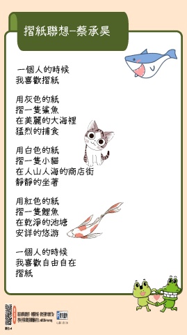 摺紙聯想-蔡承昊 一個人的時候 我喜歡摺紙 用灰色的紙 摺一隻鯊魚 在美麗的大海裡 猛烈的捕食 用白色的紙 摺一隻小貓 在人山人海的商店街 靜靜的坐著 用紅色的紙 摺一隻鯉魚 在乾淨的池塘 安詳的悠游 一個人的時候 我喜歡自由自在 摺紙