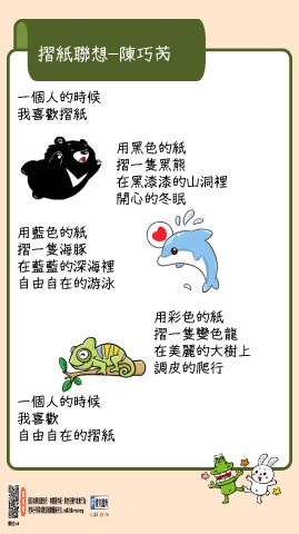 摺紙聯想-陳巧芮 一個人的時候 我喜歡摺紙 用黑色的紙 摺一隻黑熊 在黑漆漆的山洞裡 開心的冬眠 用藍色的紙 摺一隻海豚 在藍藍的深海裡 自由自在的游泳 用彩色的紙 摺一隻變色龍 在美麗的大樹上 調皮的爬行 一個人的時候 我喜歡 自由自在的摺紙蒓