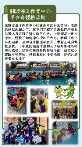 關渡海洋教育中心- 平台舟體驗活動 在關渡海洋教育中心的鯊魚老師和因努特人老師 的幽默教學之下,孩子們了解了原來我們所認為 的獨木舟正確名稱叫做平台舟。一整個早上泡在 泳池,體驗了如何操作控制平台舟,參與了水上 平衡遊戲,互助合作搬運平台舟,學習正確穿戴 救生衣,下午更認識海洋生物及了解外來種所帶 來的威脅。孩子們熱情參與各項活動,雖然初次 體驗有些害怕,但都勇敢的接受挑戰,你們的表 現實在太棒了!