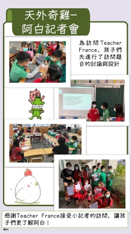 天外奇雞- 阿白記者會 為 訪 問 Teacher France,孩子們 先進行了訪問題 目的討論與設計 探訪和平島-陳家楷 感謝Teacher France接受小記者的訪問,讓孩 子們更了解阿白!
