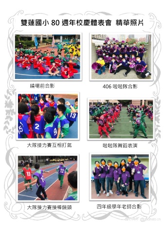 雙蓮國小 80 週年校慶體表會 精華照片 繞場前合影 406 啦啦隊合影 大隊接力賽互相打氣 啦啦隊舞蹈表演 大隊接力賽接棒鏡頭 四年級學年老師合影