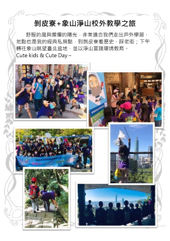 剝皮寮+象山淨山校外教學之旅 舒服的風與燦爛的陽光,非常適合我們走出戶外學習, 地點也是我的經典私房點,到剝皮寮看歷史、踩老街;下午 轉往象山眺望臺北盆地,並以淨山實踐環境教育。 Cute kids & Cute Day~