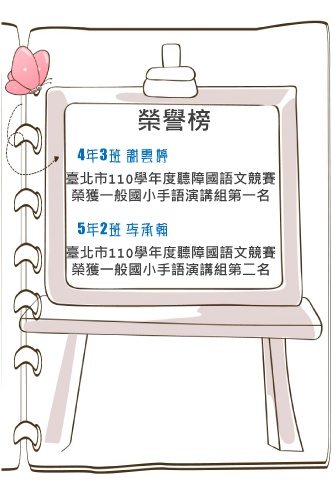 榮譽榜 4年3班 謝雲婷 臺北市110學年度聽障國語文競賽 榮獲一般國小手語演講組第一名 5年2班 李承翰 臺北市110學年度聽障國語文競賽 榮獲一般國小手語演講組第二名