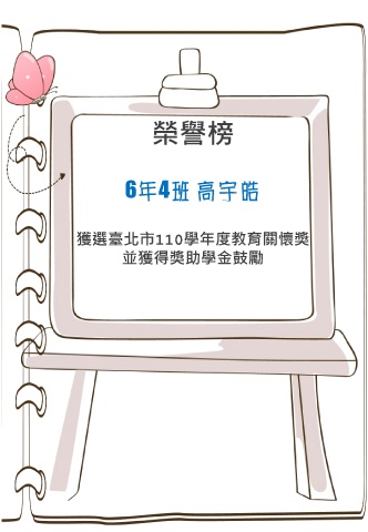 榮譽榜 6年4班 高宇皓 獲選臺北市110學年度教育關懷獎 並獲得獎助學金鼓勵