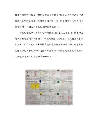 到第十六棒的時候差一點就要超出接力區了,但是第十六棒還是努力 快跑,最終嶄露頭角,我們班得到了第一名,同學們有的人非常開心 興奮尖叫,有的人則是感動到熱淚盈眶的哭了。 今天的體表會,美中不足的是採用視訊方式呈現表演,但在師長 們及少數的陪同家長參與下,最後大會圓滿的結束了!我覺得大家都 很努力,就算沒有參加大隊接力的同學也都很努力的跳舞,替有參加 大隊接力的同學們加油,這些同學都很棒,但我還是希望病毒從世界 上慢慢地消失,回到脫口罩的日子。