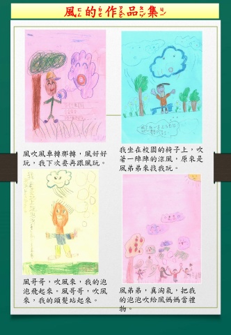 風的作品集 我坐在校園的椅子上,吹 風吹風車轉那轉,風好好 玩,我下次要再跟風玩。 著一陣陣的涼風,原來是 風弟弟來找我玩。 風哥哥,吹風來,我的泡 泡飛起來。風哥哥,吹風 風弟弟,真淘氣,把我 來,我的頭髮站起來。 的泡泡吹給風媽媽當禮 物。