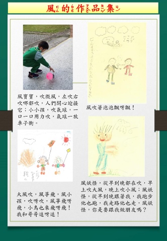 風的作品集 風寶寶,吹微風,左吹右 吹哪都吹,人們開心迎接 它;小小孩,吹氣球,一 風吹著泡泡飄呀飄! 口一口用力吹,氣球一放 車子衝。 風妖怪,從早到晚都在吹,早 上吹大風,晚上吹小風;風妖 大風吹,風箏飛,風小 怪,從早到晚跟著我,我跑步 孩,吹呀吹,風箏飛呀 他也跑,我走路他也走,風妖 飛,小鳥也來飛呀飛! 怪,你是要跟我做朋友嗎? 我和哥哥追呀追!
