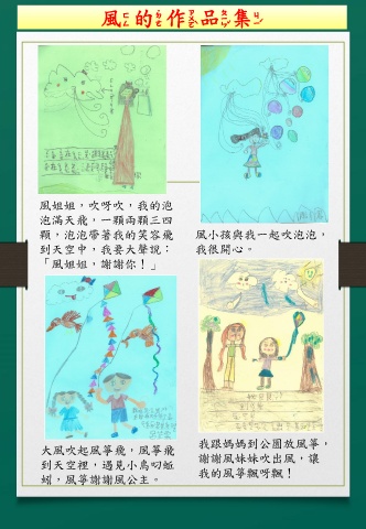 風的作品集 風姐姐,吹呀吹,我的泡 泡滿天飛,一顆兩顆三四 顆,泡泡帶著我的笑容飛 風小孩與我一起吹泡泡, 到天空中,我要大聲說: 我很開心。 「風姐姐,謝謝你!」 我跟媽媽到公園放風箏, 大風吹起風箏飛,風箏飛 到天空裡,遇見小鳥叼蚯 謝謝風妹妹吹出風,讓 蚓,風箏謝謝風公主。 我的風箏飄呀飄!