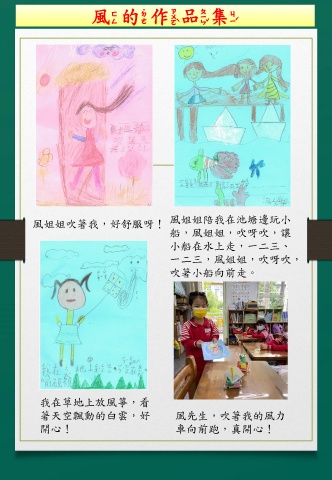 風的作品集 風姐姐吹著我,好舒服呀! 風姐姐陪我在池塘邊玩小 船,風姐姐,吹呀吹,讓 小船在水上走,一二三、 一二三,風姐姐,吹呀吹, 吹著小船向前走。 我在草地上放風箏,看 著天空飄動的白雲,好 風先生,吹著我的風力 開心! 車向前跑,真開心!
