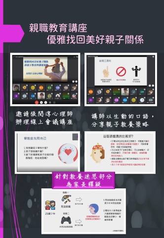 親職教育講座 優雅找回美好親子關係 邀請張閔淳心理師 講師以生動的口語, 辦理線上會議講座 分享親子教養策略 針對教養迷思部分 為家長釋疑