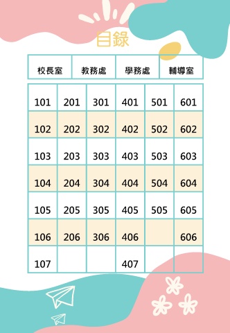校長室 教務處 學務處 輔導室 101 201 301 401 501 601 102 202 302 402 502 602 103 203 303 403 503 603 104 204 304 404 504 604 105 205 305 405 505 605 106 206 306 406 606 107 407