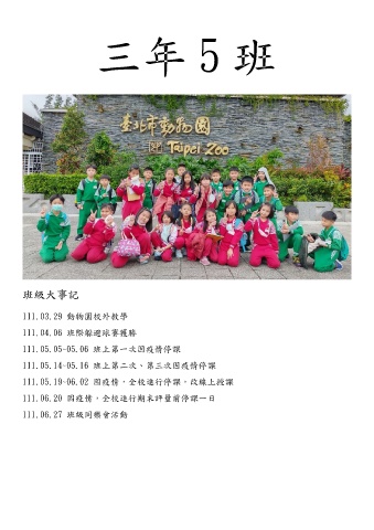 三年 5 班 班級大事記 111.03.29 動物園校外教學 111.04.06 班際躲避球賽獲勝 111.05.05~05.06 班上第一次因疫情停課 111.05.14~05.16 班上第二次、第三次因疫情停課 111.05.19~06.02 因疫情,全校進行停課,改線上授課 111.06.20 因疫情,全校進行期末評量前停課一日 111.06.27 班級同樂會活動