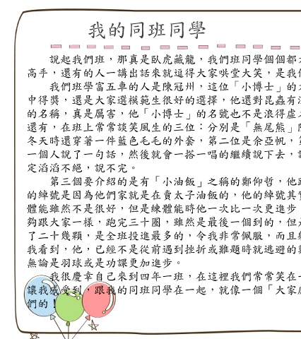 還有,在班上常常談笑風生的三位:分別是「無尾熊」陳奕睿,他會有這個綽號是因為他常常在上課睡覺、