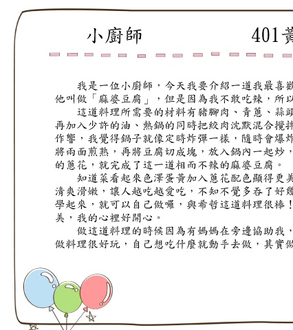 我是一位小廚師,今天我要介紹一道我最喜歡的料理「香而不辣的麻婆豆腐」,其實本來